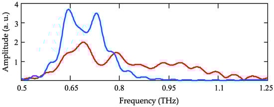 For many applications, especially for THz-driven particle acceleration, the low-frequency part of the THz spectrum (0.3 to 1.5 THz) is most useful, because the longer wavelength compares well with typical sizes of particle bunches []. In our case, the THz spectrum is given by the product of the spectrum E(ω) generated by the first pump pulse and the factor F = [1 + exp(−iωΔt2) + exp(−iωΔt3) + … + exp(−iωΔtM)] representing application of the sequence of pump pulses with the delays Δtm. The dependences of spectral amplitude EΣ(f) on frequency in the cases of δ = 1.6 µm and δ = 0.8 µm are presented in Figure 4. It is seen that the spectrum of the nearly single-cycle THz pulse (δ = 1.6 µm) is broadband and centered mainly at frequencies lower than 1 THz. The narrowband multicycle THz radiation corresponds to the δ = 0.8 µm.