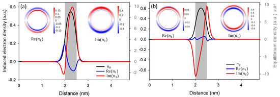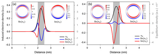 Figure 8 plots the induced charge density along with the ground-state density at LEM and HEM for Au nanoshell with 0.5 nm shell thickness. Let us recall that the equilibrium charge density is computed by using Equation (5) and the induced-charge density by the relation . The color-map plots for the real and imaginary parts of induce charge density are shown in the insets and the shaded grey regions represent the metal. As the shell thickness is very small (0.5 nm), again in this case, the charge density is nowhere flat and a significant spill-out from the metal surfaces of the shell can be noted. The equilibrium and induced charge density for Au nanoshell with nm ( nm and nm) at the corresponding resonance is shown in Figure 4b. As the metal content in this case is relatively large, therefore, the equilibrium density is constant inside the bulk region and a considerable electron spill-out from the metal surfaces into free-space can be seen.