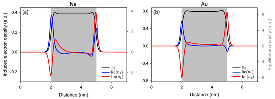 Equilibrium density and real and imaginary parts of the induced charge density for (a) Na and (b) Au nanoshell with shell thickness nm ( nm and nm).