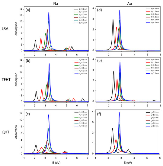 Figure 5a–c shows absorption spectra for Na nanoshell for various shell thicknesses while keeping the core radius constant. We report a systematic comparison between the LRA, TFHT, and QHT approximations. For small shell thicknesses, the plasmon resonances are well-separated. When the shell thickness is increased, as we discussed in the first paragraph of this section, LRA shows that the LEM moves towards higher energy while the HEM mode moves in the opposite direction, i.e., towards lower energies. The shift in LEM with increasing thickness is much higher than the HEM, as can be seen in Figure 5a. A similar behavior is predicted by the TFHT with increasing shell thickness, however, with reference to LRA it shows a blue shift for both plasmon modes. The shift is strong for the HEM as compared to LEM particularly for smaller shell thicknesses. According to QHT, as the shell thickness grows the LEM mode shifts towards higher energies and the HEM diminishes abruptly. It is worthy to note that the nonlocal or quantum effects influence the HEM in a dramatic manner. Even for a slight increase in the shell thickness, the amplitude of the LEM decreases very rapidly and the mode completely disappears for nm. This can be explained in the following: according to the classical theory, when the shell thickness is increased the interaction between cavity and sphere plasmons gets weaker, thus, decreasing the strength of antibonding mode. When the shell is sufficiently thick, the cavity resonance is not excited by the incident field and the shell behaves like a solid sphere. For the QHT case, we can say that even for the relatively smaller shell thickness, the antibonding mode disappears because of the effective size of the shell appears relatively bigger due to spill-out effect which weakens the cavity mode and the nonlocal broadening causes significant damping. Moreover, the viscoelastic tensor introduces an extra broadening that further damps the antibonding mode.
