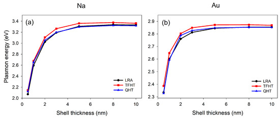 Absorption spectra for Na nanoshell with nm nm, nm) computed using different approaches are shown in Figure 2a. It can be clearly seen that for this particular geometrical parameters, the two plasmon modes supported by nanoparticle are well separated in all three cases. In fact, for a nanoshell, the hybridization of the plasmon modes and splitting between them depend upon the shell thickness. It has been shown that according to classical electrodynamics, if the shell thickness is very small, the cavity and sphere plasmons have a strong interaction and the resulting hybridized modes supported by the shell structure are very well-separated. However, by increasing the shell thickness and eventually increasing the metal content of the shell, the bonding mode occurring at the lower energy takes a blue shift and the antibonding mode occurring at higher energy moves towards the red side of the spectrum [45,46]. Figure 2a, depicting the absorption spectra for Na nanoshell, shows that the local response theory predicts lower energy (bonding) mode, resulting from the symmetric coupling of sphere-cavity modes, at 2.07 eV and higher energy (antibonding) mode, resulting from the antisymmetric coupling, at 5.51 eV. In Thomas–Fermi approximation, the low-energy mode (LEM) is slightly blue shifted by 0.07 eV (at 2.14 eV) while the high-energy mode (HEM) shows relatively large shift by 1.03 eV (at 6.54 eV) towards higher energies with respect to LRA. QHT predicts LEM at 2.12 eV slightly blue shifted with respect to LRA and red shifted with respect to TFHT while a fairly large red shift for the HEM (at 4.89 eV) as compared to both LRA and TFHT.