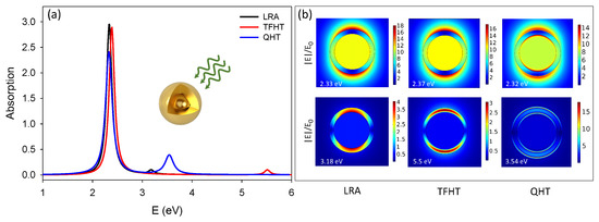 (a) Absorption efficiency of Au nanoshell with nm and nm calculated using LRA, TFHT, and QHT. (b) Electric field distribution plotted at corresponding resonance frequencies both at lower (upper panel) and higher energy modes (lower panel) computed using different methods.