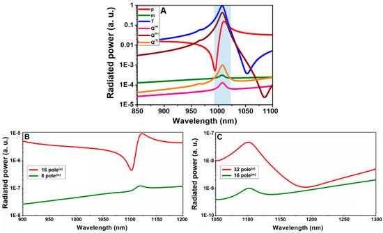 Calculated radiated power of individual electromagnetic multipoles excited in the meta-atom for (A) the 1st order toroidal solenoid and high-order toroidal moments: (B) the 2nd order toroidal solenoid and (C) the 3rd order toroidal solenoid.