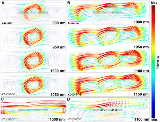 Figure 1A shows that the toroidal currents hierarchy is employed to define the theory and notations in the following descriptions. This profile contains the toroidal dipole from the 0th order to the 3rd order. Figure 4A,B compare the formation of the toroidal dipole moments in a vacuum and the presence of an alumina capacitive spacer, respectively, at and around the resonance wavelengths as vectorial H-field maps in xz-planes. Here, we try to monitor the quality of the toroidal spectral feature in the vicinity of the central wavelength to be sure about our claim. Clearly, for the vacuum condition, the toroidal moment is robust at λ ~ 1 µm, and keeps its nature around the resonance position (±50 nm) and vanishes at further wavelengths. The noteworthy point here is the formation of a single toroidal loop-current at all wavelengths, corresponding with the 1st order toroidal current. On the other hand, for the presence of an alumina spacer at the gaps, we observed a distinguished toroidal loop-current at λ ~ 1.1 µm. In this regime, the peripheral vectorial loops are correlated with the third loop-current (J3), keeping their strength around the original feature at 100 nm away from the resonance wavelength. It should be underlined that due to representing the vectorial boards in 2D panels, it is challenging to plot all loops simultaneously. To investigate the possibility of the generation of the third toroidal current loops, one should monitor the other planes (xy and yz-planes) around the unit cell to monitor the presence of (J2). Figure 4C,D illustrate and evaluate the vectorial maps in the yz-plane for the excitation of a second loop-current (J2) in the vacuum and alumina-filled gap regimes, respectively. Clearly, for the gaps without the spacer, the projected magnetic field is not perturbed, while for gaps with an alumina spacer, a spinning pattern is formed correlating with the second loop (J2). This strongly verifies the excitation of the super-toroidal spectral feature in the proposed plasmonic meta-atom.