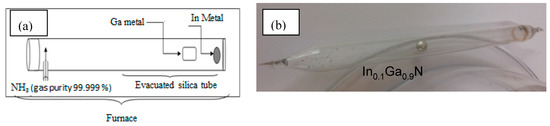 (a) Experimental setup. The tube contains In and Ga metals and NH3 gas. (b) The resulting indium gallium nitride (InxGa1−xN) alloy after reaction.