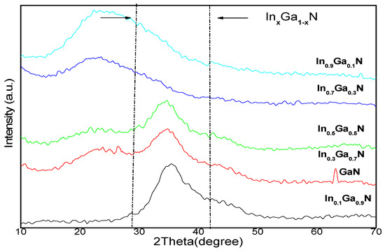 XRD patterns of InxGa1−xN (x = 0.1, 0.3, 0.5, 0.7 and 0.9) thin films deposited on glass substrates using thermal vacuum evaporation (TVE).