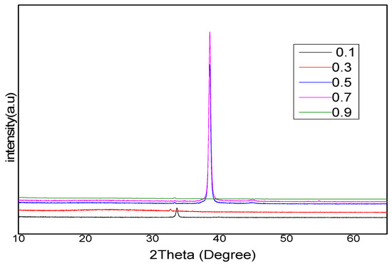 Figure 4 shows the XRD patterns of InxGa1−xN thin films deposited by thermal vacuum evaporation (TVE). InxGa1−xN thin films grown on glass at x = 0.1, 0.3, 0.9 have diffraction peaks of 33°, 32° and 33°, respectively, with a hexagonal structure as matched with ref [22]. At x = 0.5 and 0.7, the diffraction angle is obtained at 2θ of 38° with the cubic structure that matched with ref [23]. No extra peaks were observed in all samples and it may mean that no In droplets or phase separation was observed from the InxGa1−xN layers [24]. This indicates a good structure quality and orientation.