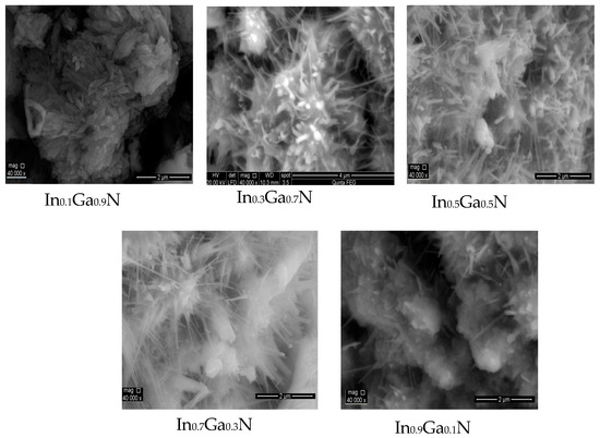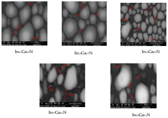Field emission scanning electron microscopy (FESEM) for bulk alloys at InxGa1−xN heated at 950 °C (0.1 ≤ x ≤ 0.9).