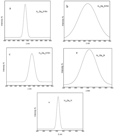 PL-spectra of InxGa1−xN thin films deposited at (0.1 ≤ x ≤ 0.9).