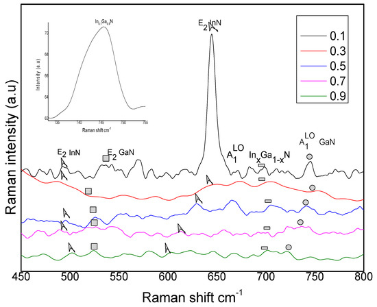 It has been established that the InxGa1−xN thin films exhibit two modes of behavior, i.e., the Raman spectrum consists of the A1LO and E2 lines which vary in frequency between those of the two binary compounds InN and GaN [32]. The Raman measurements of the InxGa1−xN thin films were made at room temperature in the backscattering configuration. The spectrum recorded at the excitation wavelength is λexc = 530 nm. Raman spectra from InxGa1−xN thin films (x = 0.1, 0.3, 0.5, 0.7 and 0.9) are displayed in Figure 8. The InN, GaN and InxGa1−xN are stable in the hexagonal wurtzite phase, in which their scattering at the E2 and A1LO phonons is allowed. The frequency values of GaN at A1LO = 734 cm−1 and E2 = 568 cm−1, 570 cm–1, while the frequency values of the InN A1LO = 586 cm−1, and E2 = 488cm−1. Also, there is a phonon band in the frequency region of the A1LO InxGa1−xN vibrations (700–750 cm–1). The observed behavior of the modes is reported in several previous works [33]. In (x = 0.3, 0.5, 0.7 and 0.9) compositions, there is a shift of the frequency and high broadening due to elastic strain between the thin film and glass substrate, and also due to high Indium content [34].
