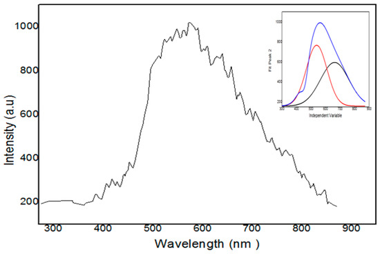 The EL spectra, as shown in Figure 11, show that InxGa1−xN is shaped as a wide spectrum in the 300–900 nm range. The EL spectra for the LED structure contain glass/GaN/In0.1Ga0.9N: Zn/In0.1Ga0.9N/In0.1Ga0.9N: Mg coated by Au at both sides of p and n types, forming the InxGa1−xN LED structure. The use of Gaussian line shapes allowed the discrimination of three overlapping luminescence-using bands with their maximums at 426 nm, 548 nm, and 599 nm respectively. The shorter wavelength in the range of 402 to 426 nm may be due to two reasons. Firstly, it may be due to the In0.1Ga0.9N deposited on GaN which gives blue emission spectra. This blue emission of EL spectra suggests that the luminescence mechanism is in donor–acceptor transition in the In0.1Ga0.9N active layer co-doped with Zn. The In0.1Ga0.9N active layer of the blue spectra is doped with Zn. Thus, the Zn acceptor level is expected to exhibit Gaussian broadening and both the valence band and the conduction band will have band tails [35,36]. The shorter wavelength at 548 nm may be due to the p-type doping which gives green emission [37]. The EL curve of the device shows a green peak emission, which implies that the recombination of holes and electrons occurs predominantly in the green light near the p- In0.1Ga0.9N layer. This phenomenon indicates that the Mg doping concentration of the sample has little effect on hole injection into the LED structure. So, most holes are trapped in the green emission due to their lower mobility than that of electrons in the In0.1Ga0.9N/GaN. Due to Mg doping into the material, the recombination of holes and electrons occurred [38,39]. There is a yellow band at 560 nm [40] that may belong to GaN and a new red band near 620 nm which may be due to a recombination via deep levels in In0.1Ga0.9N. The violet band at 410 nm can be ascribed to a donor–acceptor pair recombination in the GaN. According to the InxGa1−xN structure, a blue emission originating from a recombination in the InxGa1−xN: Mg deposited on the InxGa1−xN layer and shifted toward a short wavelength (599 nm). Since the mobility of electrons is faster than holes, electrons are injected from the n- InxGa1−xN: Zn side, through the InxGa1−xN layer, to the p- InxGa1−xN: Mg side and little recombination occurred in the n- InxGa1−xN and InxGa1−xN layers. Thus, the blue emission peak at 599 is observed [41].
