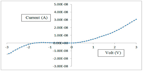 Figure 12 shows the room temperature I–V curve (under dark) measured by two electrodes Potentionstat Auto Lab. 70,708 with the positive electrode of the electric source connected to the Au metal contact upon the In0.1Ga0.9N LED. The results show that the diode has rectifying current characteristics with a current density of 1.2 × 10−7 A/cm2 for the diode area of 0.25 cm2 [42].