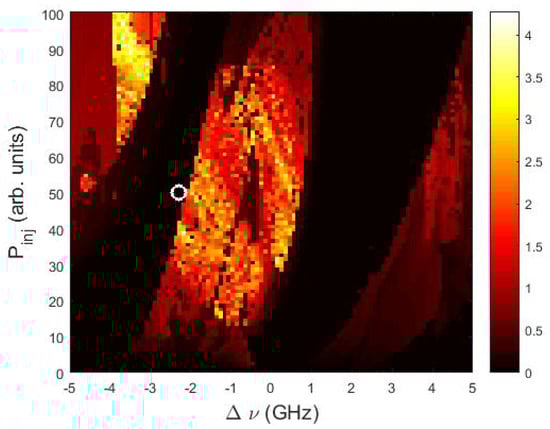 Relative height of the intensity oscillations when no perturbation is applied (), as a function of the frequency detuning, , and the injection strength, . The color code displays , with and being the maximum and the average height of the intensity oscillations, respectively; the symbol indicates the parameters used in Figure 2: ns and GHz.