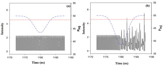 Time series of the laser intensity when the variation of the injected power is ns (a) and ns (b). In panel (a) we see that the variation is small and the intensity is always below the threshold, therefore, the variation of is not detected. In contrast, in panel (b), is large enough to trigger the emission of intensity pulses that are high enough to cross the threshold (indicated with a dashed line).
