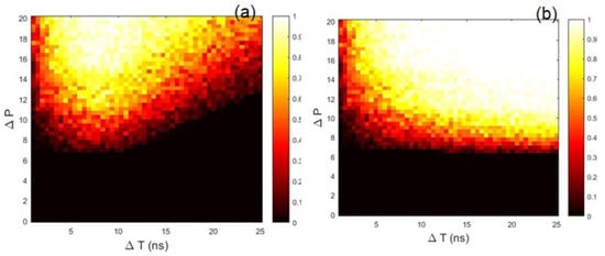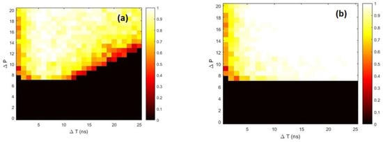 Success rate as a function of the perturbation amplitude, , and duration, . The detection time interval is ns (a), 100 ns (b). Other model parameters are ns, , and GHz.