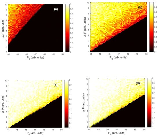 The model was simulated with a 4th order Runge–Kutta method with an integration step of 1 ps and the parameters indicated in Table 1. In order to find appropriated injection parameters, first we varied and (no perturbation was applied, i.e., ), and for each set of parameters long time traces of the intensity dynamics were simulated (5 s), and the maximum, , and the average, , intensity value were calculated.