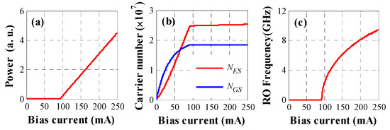 Figure 2a shows the power-current (P-I) curve of the free-running ES-QD laser. Obviously, the threshold current (Ith) of the laser is about 92.0 mA. As the current increased from 92.0 mA to 250.0 mA, the output power increased linearly. Figure 2b displays the variations of the carrier number in ES and GS with the current. From this diagram, it can be seen that the carrier numbers in ES and GS are almost constant for the laser biased above the threshold, and the former is larger since the degeneracy of ES is twice that of GS [33]. Furthermore, by using small signal analysis, the relaxation oscillation (RO) frequencies of the ES-QD laser at different bias currents can be obtained, as shown in Figure 2c. With the increase of the current, the RO frequency increases nonlinearly. In the following discussion, the current of the laser is fixed at I = 184.0 mA (= 2Ith) and the corresponding RO frequency is about 7.60 GHz.
