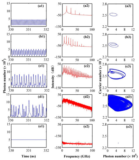 Our simulations demonstrate that after introducing an optical injection, the ES-QD laser can exhibit different dynamical states. Figure 3 shows the time series, power spectra, and phase portraits of the ES-QD laser, under optical injection with frequency detuning ∆ν = −14.00 GHz and different injection coefficient K. For K = 0.30 (Figure 3a1–a3), the time series behaves as a periodic oscillation whose fundamental frequency is about 14.26 GHz, which can be captured from the power spectrum, and the trajectories of phase portrait show a clear limit cycle feature. As a result, it can be determined that the ES-QD laser operates at the period one (P1) oscillation. For K = 0.33 (Figure 3b1–b3), the periodic waveform with two peak intensities can be clearly observed in the time series, the sub-harmonic frequency (about 7.13 GHz) appears in the power spectrum, and the corresponding phase portrait possesses two loops that are intertwined together. Under this case, the ES-QD laser exhibits the period two (P2) oscillation. For K = 0.49 (Figure 3c1–c3), multiple peaks with different intensities emerge in the time series, multiple new frequency components appear upon the power spectrum, and the phase portrait shows the overlap alternation of multiple loops. Therefore, the dynamics of the ES-QD laser can be judged as the multi-period (MP) state. For K = 0.64 (Figure 3d1–d3), the peak intensity of the time series behaves as an irregular fluctuation, the associated power spectrum broadens, and the phase portrait exhibits a strange attractor. Based on these features, the dynamic state of the ES-QD laser can be determined to be the chaotic pulsation (CP) state. When K is increased to 0.90 (Figure 3e1–e3), the time series shows a stable output, no obvious peak can be observed in the power spectrum, and the corresponding phase portrait shows a stable point. Further calculation shows that, under this condition, the lasing frequency of the ES-QD laser is just the frequency of the injection light. As a result, it can be judged that the ES-QD laser operates at the injection locking (IL) state.
