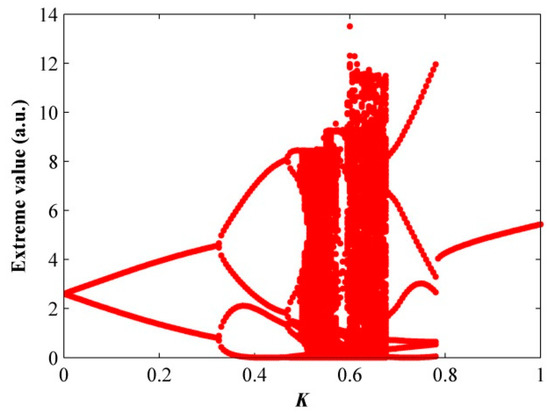 Figure 4 shows a bifurcation diagram for observing the dynamical evolution of the ES-QD laser with the injection coefficient K at Δν = −14.00 GHz. As shown in this diagram, when the injection coefficient K increases from 0 to 0.32, the output waveform has two extreme values and the ES-QD laser can be judged to operate at the period one (P1) oscillation. When the injection coefficient K increases from 0.32 to 0.47, the output waveform has four extreme values and the laser can be determined to be the period two (P2) oscillation. Further increasing the injection coefficient K from 0.47 to 1, the ES-QD laser presents the multi-period (MP), the chaotic pulsation (CP), and the injection locking (IL).