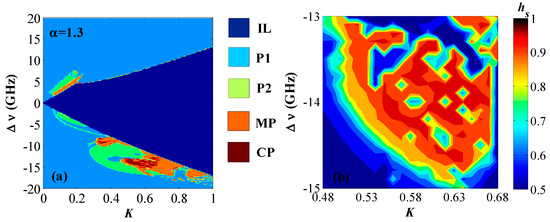 where hs = 0 and hs = 1 represent a completely predictable process and a completely stochastic process with uniform probability distribution, respectively. We use a 670 ns length of the time series and the embedding dimension D = 6 to calculate the PE. Figure 5b displays the complexity of the CP in the parameter space of K and ∆ν, where different colors represent different complexity values. From this diagram, it can be observed that the CP state with a high complexity of 0.95 < hs < 0.98 is mainly located at the regions of 0.55< K < 0.67 and −14.50 GHz < ∆ν < −13.30 GHz.