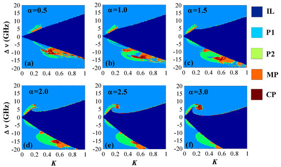 It is well known that the linewidth enhancement factor (LEF) is one of key parameters that affects the spectral linewidth, the mode stability, as well as the nonlinear dynamics of SLs under external perturbations [44,45,46]. The above results were obtained under a fixed LEF value of 1.3. In Reference [33], it is pointed out that the differential gain of each energy level and the energy separation between resonant and non-resonant states will have a profound impact on the LEF value. As a result, it is necessary to investigate the effect of the LEF on the nonlinear dynamics of ES-QD lasers. Figure 6 shows the mappings of the nonlinear dynamic behaviors in the parameter space of ∆ν and K under different α. For α = 0.5 (Figure 6a), in the region of ∆ν > 0, the injection locking (IL), period one (P1), period two (P2), and multi-period (MP) can be observed, while in the region of ∆ν < 0, besides IL, P1, P2, and MP, a chaotic pulsation (CP) region (brown) can be found nearby (∆ν = −10.00 GHz, K = 0.45), and is surrounded by the MP state. Additionally, as shown in this diagram, the stable IL region (dark blue) almost symmetrically distributes in both sides of ∆ν = 0. For α = 1.0, 1.5 (Figure 6b,c), with the increase of the LEF value, the area of the P2 region (light green) increases significantly, the IL region slowly moves towards the range of ∆ν < 0, and the CP region shifts to nearby (∆ν = −15.00 GHz, K = 0.6). For α = 2.0, 2.5, and 3.0 (Figure 6d–f), as the LEF value increases, the IL region gradually shifts to the negative detuning side and asymmetrically distributes in both sides of ∆ν = 0, but its area is approximately unchanged. In addition, the area of the CP region gradually expands (shrinks) in the range of ∆ν > 0 (∆ν < 0), and finally predominantly distributes nearby (∆ν = 6.00 GHz, K = 0.25). Moreover, the area of the P2 region is approximately unchanged and the area of the MP region (orange) gradually shrinks. It can be seen that the change of LEF value profoundly affects the dynamic distribution of the ES-QD laser under optical injection.