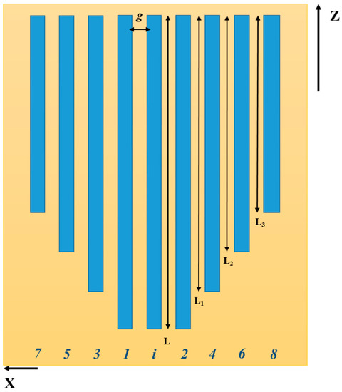The operating principles of the proposed splitter are based on mode coupling phenomena. When the two waveguides (waveguide 1 and 2) are infinitely far apart, each of these waveguide modes will propagate independently with their propagation constants and . However, when the two waveguides are close, they become coupled and exchange power as a function of propagation direction. Therefore, the spatial dependences of one mode amplitude will be modified by the other [29,30,31]. The efficiency of the power transfer from one waveguide to another waveguide due to the behavior of the supermode is represented by coupling coefficient . The distance over which the maximum amount of power is transferred from one waveguide to another is represented by coupling length defined as: