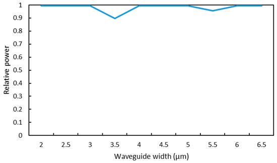 To obtain the best power output distribution, the parameter value of the proposed structure had to be optimized. The simulations and the numerical calculations were conducted using semi-vectorial BPM from OptiBPM combined with Matlab software. The field propagation through the structure was conducted using the finite difference beam propagation method (FD-BPM), which is suitable for the proposed design. The proposed splitter was designed using the layout designer provided in the OptiBPM which is based on the proposed mathematical model with previously mentioned design parameters. The modal input field was used as the starting field and 1 µm as the -offset. Modal input was obtained from the Mode 3D solver calculation. After the input plane had been defined, the global data was set with the modal refractive index, and the wavelength was set at 450 nm. The proposed design performance was investigated by performing 3D isotropic simulations with a propagation step of 0.45 µm, and with the number of mesh points for both X and Y being 101. First, the width and thickness of each waveguide were varied from 2 µm up to 6.5 µm, keeping other parameters constant. The result is presented in Figure 3. It can be noted that from 2 µm up to 3 µm; 4 µm up to 5 µm, and 6 µm up to 6.5 µm the relative optical power is almost perfect at 0.999. Although the 2 µm up to 3 µm waveguide width gave the same result as the 4 µm up to 5 µm, in this work the 4 µm waveguide width was chosen.