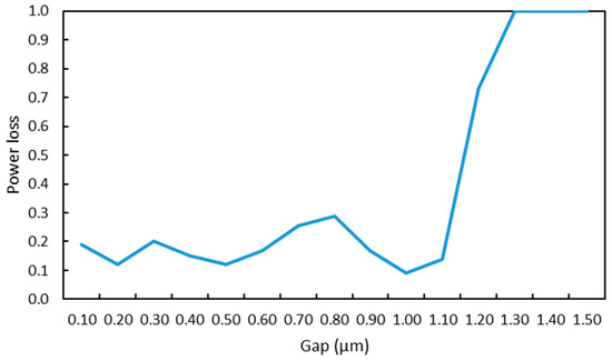 Figure 4 shows that from waveguide thickness 2 µm up to 3 µm, the relative optical power increases from 0.893 up to 0.922. From 4 µm up to 5 µm, the relative power output has an almost stable value at 0.999. Based on the results gained from the TE polarization, the optimal value for both 4 µm width and 4 µm thickness of each waveguide was chosen. This geometrical value allowed a single-mode propagation and gave the highest relative power distribution. Next, the other waveguide parameters were optimized, i.e., the gap and waveguide length. To obtain the optimum gap, the power loss was observed for various gaps between two waveguides. The gaps were varied, starting at 0.1 µm up to 1.5 µm. The results are presented in Figure 5.