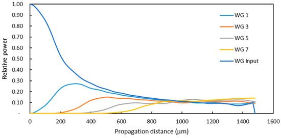 Next, based on the optimum gap result, the coupling length and the coupling coefficient were calculated analytically. By solving Equation (1) combined with semi-vector BPM simulations, the value of coupling length and coupling length can be obtained. The calculated value of obtained was 112.323 µm with κ = 0.0140 µm−1. Then, based on this result, the length of each waveguide in the proposed structure was optimized to obtain uniform distribution and single mode propagation in each waveguide. The observation was conducted by investigated the power transfer of each waveguide, as presented in Figure 6. It can be noted that the input power completely transferred to other waveguides at z = 1480 µm.
