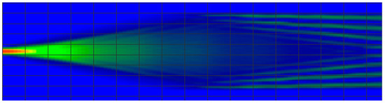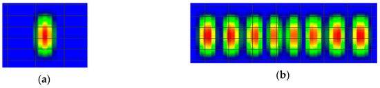 Figure 7 presents the optical field distribution throughout the proposed splitter, while Figure 8 shows the mode propagation for λ = 0.45 µm at the input and output ports. It should be noted that at the input port z = 0, the optical power was a single mode, then after propagating through the proposed divider, this optical power was split into eight separate single modes. The colors red, yellow, and green in the figures represent the level of the optical field. The color red inside the GaN indicates that a strong confinement was obtained within the GaN layer.