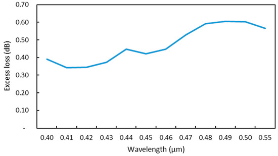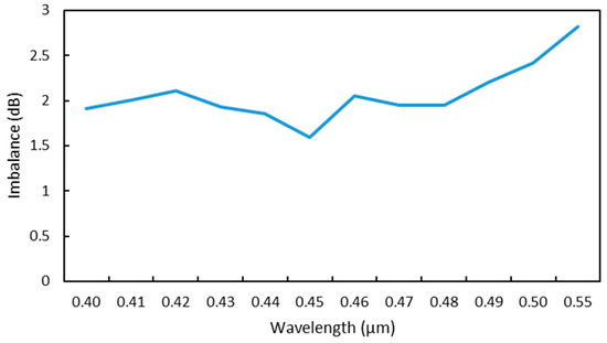 where is the total optical output power, and is the optical power injected into the input waveguide. and are the lowest and highest optical power values at the eight output ports. Based on this calculation, it was determined that the power splitter has an excess loss of 0.46 dB and yields a maximum power imbalance of 0.51 dB at λ = 0.45 µm. Furthermore, the effects of the operating wavelength variation on excess loss and imbalance were also observed, the results for the TE mode polarization are shown in Figure 10 and Figure 11.