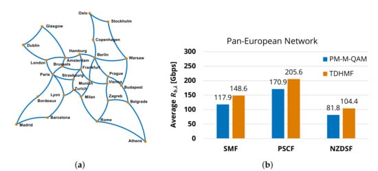 (a) Pan-EU COST topology—28 nodes, 41 links, 637 km average link length, 2.98 average node degree; (b) average bit-rate per LP using different fiber types and multi-rate transceivers (adapted from [26]).