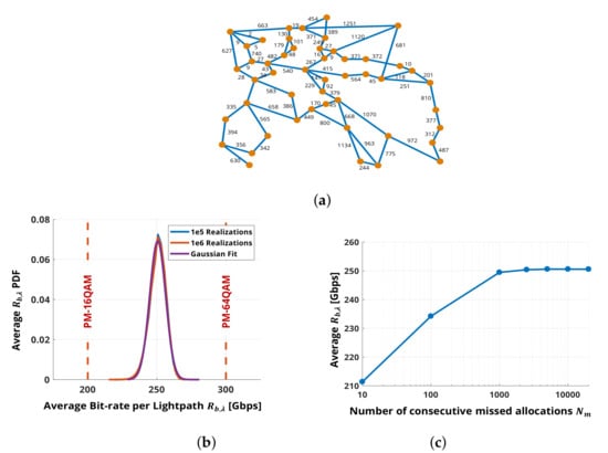 As a first investigation, we have tested SNAP in progressive traffic loading on the Pan European network topology [24] of the EU project “IDEALIST” [38] depicted in Figure 2a. Links are assumed to be uniform in terms of fiber and erbium doped fiber amplifier (EDFA) types. As fiber pairs, we consider SMF parameters as in Table 2, with nonlinear index coefficient corresponding to a nonlinear coefficient 1/W/km. ROADMs are assumed to introduce 10 dB of routing loss fully recovered by an EDFA with 5 dB of noise figure at the node output without any further filtering impairment. Span lengths are not uniform and they are obtained from the topology data in [38]. On the transmitter level, we transmit a maximum of LP (wavelengths) per fiber over the 4 THz of C-Band on the 50 GHz ITU-T grid. As in Section 4, flexible-rate transponders based on pure PM-M-QAM or on TDHMFs are adopted and operating at the same gross symbol rate , net symbol rate and pre-FEC BER. First, the convergence of the MCA, i.e., the number of Monte Carlo iterations needed to obtain statistically stable results, has been verified. To this aim, the PDF of the average bit-rate per LP given by Equation (4) obtained with and has been estimated. As for the routing policy, we set -best-SNR with . PDFs are reported in Figure 2b together with a Gaussian fit for TDHMF. Due to the central limit theorem, the average PDF converges towards the Gaussian distribution with respect to the LP allocations, so its average value can be used as a figure of merit in the comparison of different implementations of the physical layer. This can be explained with the fact that is in fact computed as a sum from a large set of random bit-rates, whose stochasticity is mainly caused by network blocking and routing strategy. Hence, increasing , i.e., exploring a larger routing space; thus, expanding the variability of the allocation process leads to the increase of the variance. It can be observed that, for , the algorithm has already converged since the curves perfectly match. Moreover, independently from the LP allocation order, the considered network topology delivers nearly 250 Gbps per LP on average. This means 5 BpS per polarization, larger than the 4 BpS of a pure PM-16-QAM. In addition to the PDF, we report in Figure 2c the average bit-rate per LP versus the number of missed allocations required to stop the Monte Carlo iteration at . The resulting saturates from . In light of this evidence, we safely set and to obtain the results presented in the next section.