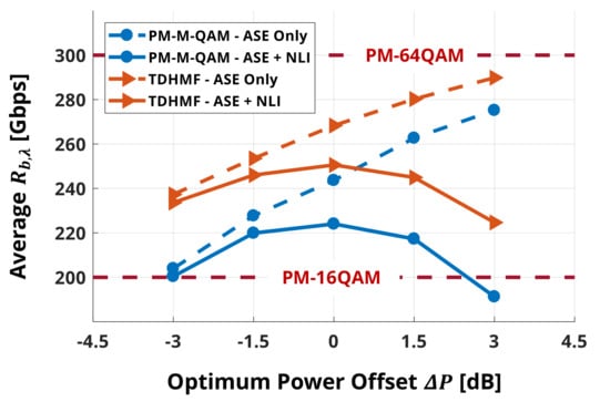 being the power offset dB. is the optimized launch power per span according to the LOGO principle by means of IGN model. Further investigations on the nonlinear modeling are presented in the next subsection. Each Monte Carlo analysis was performed both including the NLI effect and excluding it by setting to zero in Equation (3). Figure 3 reports versus for each of the two modulation strategies, both considering and neglecting NLI, with . The pure-format curves displays an Gbps at optimum launch power, while TDHMF has a 12% advantage allowing to reach Gbps as already shown in Figure 2b. As previously explained in Section 4, the considerable TDHMF advantage is due to its ability to better exploit the available SNR on LPs, at the cost of an increased complexity of the DSP, i.e., an increased CAPEX for node equipment. Although elastic, the pure format approach allows a coarse granularity in SNR vs. BpS. In fact, to move from PM-QPSK to PM-16-QAM [39], nearly 6 dB of SNR increase is required. For comparison, the graph also shows what happens when neglecting NLI, showing that tends to saturate at the maximum possible rate Gbps, corresponding to the use of PM-64-QAM on all LPs. Neglecting NLI would thus overestimate of 8% at the optimum power, but this error would grow up to 20% if we operate at dB. These results have shown that an accurate estimation of the NLI is necessary since inaccuracies in the QoT lead to substantial under/overestimation of the network capacity metric.