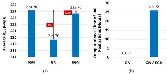 Using the NLI efficiency obtained with the GN and EGN models, we re-evaluated the SNR for each LP and re-assigned the corresponding . Due to the high computational effort needed to evaluate NLI efficiency using GN and EGN models, such a process was performed only for the first 100 Monte Carlo realizations. The computation required around 26 h using a 12-core CPU, to be compared with the approximately 3 s needed on the same machine using the IGN model (Figure 4b). In Figure 4a, we report the resulting for the pure format approach for the three different NLI models with the performance loss for coherent GN and EGN model with respect to the IGN model. As the GN model overestimates NLI with respect to the IGN, a lower is obtained for GN. The EGN model instead yields, as expected, results that are closely comparable with the IGN ones. In particular, by using a GN model, is estimated to be around 2% smaller than the one obtained with IGN. For EGN, this loss reduces to less than 0.2%, thus the similarity between GN and EGN model is evident. However, it is worth noting that the NLI efficiency has been re-obtained with GN and EGN a posteriori. Other than not computationally convenient, these models could not be used in real time because they lack the incoherent accumulation over fiber spans, which has been assumed in Section 2.