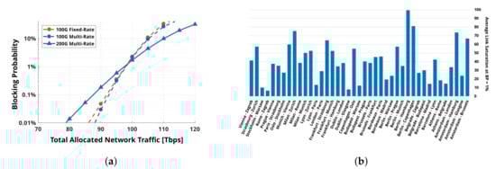(a) average blocking probability vs. average total allocated network traffic; (b) average link spectral load at . The thicker the lines, the more saturated the links (adapted from [26]).