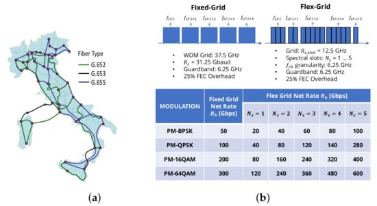 - Cantono, M.; Curri, V. Flex- vs. fix-grid merit in progressive loading of networks already carrying legacy traffic. In Proceedings of the 2017 19th International Conference on Transparent Optical Networks (ICTON), Girona, Spain, 2–6 July 2017. [Google Scholar] [CrossRef]