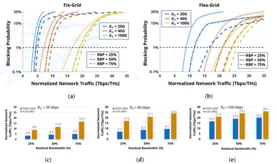 Upper row: blocking probability against the total traffic per residual spectral unit for (a) fix-grid and (b) flex-grid spectral uses. Blue, red and yellow lines refer to of 20, 40, 100 Gbps, respectively. Dotted, dash-dotted and dashed lines refer to 25%, 50% and 75% of residual bandwidth percentage , respectively. Lower row: total traffic per residual spectral unit T at for fix- and flex-grid and different for of (c) 20 Gbpsl; (d) 40 Gbps; (e) 100 Gbps (adapted from [29]).