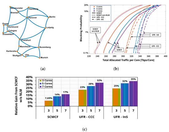 (a) German topology—17 nodes, 26 links, 207 km average link length, 3.06 average node degree; (b) vs. Total Allocated Traffic per Core varying the SDM cardinality (3 orange, 5 blue, 7 green) and SDM solutions: SCMCF w/o NLM (dotted), SCMCF (solid), UFR-CCC (dash-dotted) and UFR-InS (dashed); (c) relative gain respect to SCMCF w/o NLM on the Total Allocated Traffic per Core varying the SDM cardinality and scenarios at (adapted from [32]).