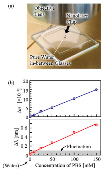The evanescent field of the laser mode of nanolasers penetrates about 120 nm outside the semiconductor when in the water. When a medium with a high refractive index, such as a bio-molecule, is overlapped with this area, the equivalent refractive index of the mode increases, and the emission wavelength shifts to a longer wavelength. The easiest experiment is the monitoring of the liquid refractive index [10,17]. Figure 4 shows an example of such measurement, exhibiting the wavelength shift of the nanolaser measured in phosphate buffered saline (PBS), which is often used in biosensing experiments. In here, PBS was diluted to various levels of concentration and its refractive index was measured using a commercially-available refractometer. Both the refractive index and the wavelength showed liner changes following the changes in concentration, and from their responses, the refractive index of the nanolaser is estimated to be 470 nm/RIU. When the maximum wavelength fluctuation of ±100 pm is taken into consideration, the detection limit becomes 2 × 10−4. If stabilization is made, fluctuation can be suppressed by about one digit, and the measurement of 10−5 is possible.