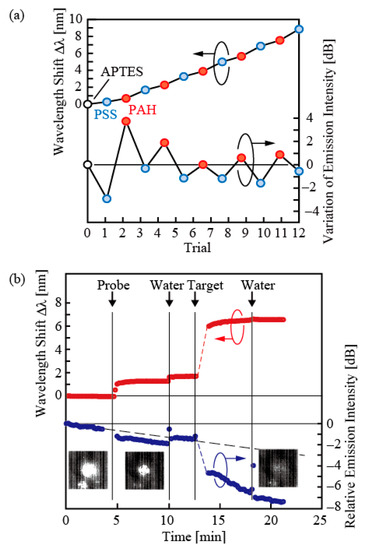 Change in oscillation wavelength and emission intensity by the adsorption of charged medium. (a) Alternate adsorption of polyelectrolytes. (b) Probe/target DNA adsorption.