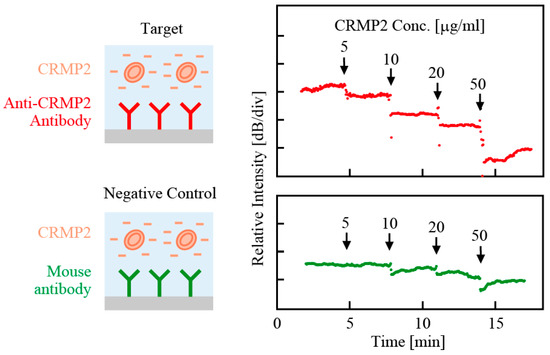 Such a sensitivity of emission intensity was also applied to detecting antigen-antibody reaction of collapsin response mediator protein 2 (CRMP2), which is a promising biomarker candidate for neuropsychiatric diseases existing in peripheral white blood cells [23]. The CRMP2 sample was prepared as a standard protein and sodium dodecyl sulfate (SDS) was introduced as an anionic surfactant to enhance the net negative charge of the protein. The nanolaser was modified in advance with anti-CRMP2 antibody and then photopumped at a constant power. The emission intensity was monitored during the antigen–antibody reaction. CRMP2 was detected as a decrease in the emission intensity, and a smaller decrease against a non-specific mouse antibody was also confirmed as the negative control, as shown in Figure 9 [24]. A standard curve that enables quantification of CRMP2 in the analyte and a lower limit for detection of 3.8 μg/mL that satisfies the requirement for clinical biomarker testing were obtained. Without the requirements of any kind of labels and spectral analyses, this technique allows for simple, rapid, and low-cost biomarker detection.