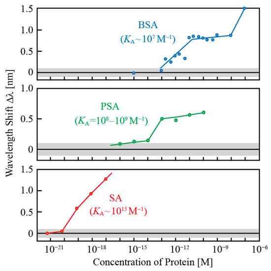 Nanolasers possess superhigh sensitivity that is not available from other photonic sensors. In detecting proteins, the nanolaser surface is functionalized by, for example, APTES followed by glutaraldehyde (GA), an immobilizing material that causes a crosslinking reaction. With such functionalization, an experiment was conducted to adsorb and sense three types of proteins [26,27,28]. The first type was bovine serum albumin (BSA), which is a generic protein. This was chemically adsorbed on GA as is (KA ≈ 107 M−1). The second type was streptavidin (SA), which is also a generic protein. Biotin, which is a type of vitamin that has strong specific binding with SA (KA ≈ 1015 M−1), was attached on GA, and SA was introduced and adsorbed to it. The third type was anti-PSA antibody, which was modified on GA and antigen–antibody reaction when PSA was triggered (KA ≈ 108–109 M−1). Each protein was diluted with pure water into many different concentrations through pipetting. The concentrations of PSA were verified down to 0.3 pM with ELISA, error was corrected, and the concentrations below that were estimated from the repetition of dilutions. Each sensor was immersed in solution for about 1 h, and the wavelength was measured in pure water after rinsing it with pure water. Figure 10 shows an example of sensing characteristics at low-concentration regions. Sensing each protein showed a wavelength shift after the limit concentration that reflects differences in KA. Although precise discussion of values is difficult owing to the fluctuations between tests and devices, there is qualitative reproducibility. A shift was observed for the chemical adsorption of BSA, which has the lowest KA, from sub pM, the SA-biotin specific binding from sub aM, and PSA from sub fM, respectively. The concentrations are several orders of magnitude lower than the region above 10 nM expected from refractive index sensing, and therefore, the origin of this shift is different from that appeared for the adsorption of high concentration electrolytes and DNAs in Figure 8. The SA detection did not show such a wavelength shift at an extremely low concentration if biotin modification was removed. In the PSA detection, wavelength shift was significantly reduced when mouse antibody was modified instead of anti-PSA antibody. Moreover, when BSA was introduced as a contaminant, selective detection of SA or PSA was successful even when the concentration of BSA was increased 1010 times to 1013. For these experiments, surfactants, such as Tween 20 or ethanolamine, were also introduced as respective solutions to limit non-specific adsorption of BSA.