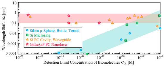 Relation between the wavelength shift and detection limit concentration of the target biomolecules for various label-free photonic biosensors that are operated based on optical resonance.