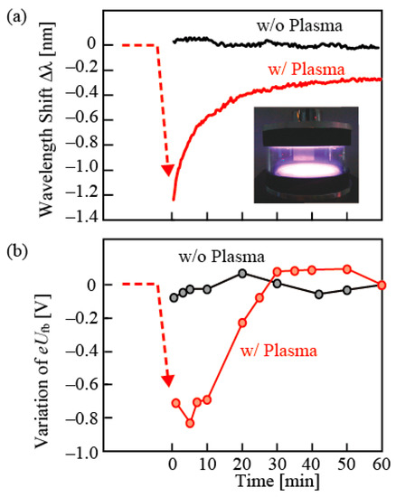Response of GaInAsP nanolaser after plasma exposure. (a) Wavelength shift. The inset shows the appearance of the plasma exposure. (b) Flat band potential.