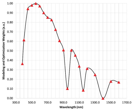 Solar spectrum in the visible and near-infrared regions. Relative weights for wavelengths used in the optimization and analyses are shown with the red triangles [15].
