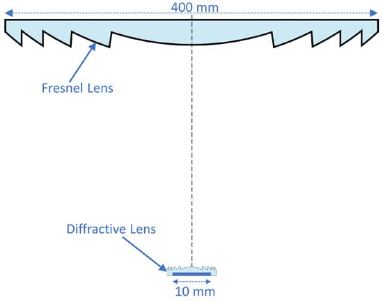 The primary optical element is a circular Fresnel lens with a diameter of 400 mm, and the receiver is a circular solar cell with a diameter of 10 mm. The corresponding geometric concentration ratio is 1600×. A schematic drawing of the system is shown in Figure 2. This is a representative example, and the same approach can be scaled to different Fresnel lens and solar cell dimensions.