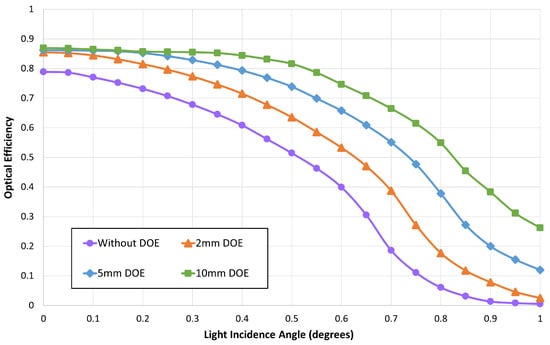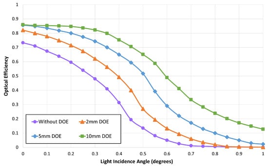 The results shown in Figure 3 and listed in Table 1 are for the nominal assembly of the solar concentrator system. However, assembly equipment have limited alignment accuracy, and there could be cases of misalignment. One method to prevent misalignment could be to use active alignment of the solar cell and the SOE [31,32]; however, this makes the assembly procedure more complex, and increases costs. In order to analyze how misalignment could impact both the optical efficiency and acceptance angle, the case of 2 mm misalignment between the Fresnel lens and the diffractive SOE was simulated. As shown in Figure 4, with this misalignment, the optical efficiency for designs without DOE drops from 0.79 to 0.73, whereas for the 10 mm thick diffractive SOE design, the drop is negligible. In addition, the acceptance angle of the design without DOE drops to ±0.13°, whereas the acceptance angle for the 10 mm thick diffractive SOE design is ±0.38°. Thus, we can conclude that incorporating a suitable diffractive SOE makes the concentrator design less sensitive to assembly tolerances.