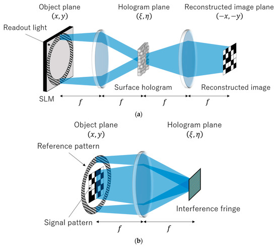 The optical system of the surface collinear holographic memory proposed in this paper is shown in Figure 1. Figure 1a shows the optical system assumed to be designed in the case of reconstruction, and Figure 1b shows the optical system assumed for calculation in the case of hologram design. One of the most important features of the proposed method is that the optical system, as shown in Figure 1b, is not actually set up because the hologram is designed directly instead of being recorded by light. As shown in Figure 1a,b, the wavelength is , the focal length of the lens is , and the optical system is a system in the case of reconstruction, and a system in case of hologram designing. A phase-only surface hologram with an arbitrary step structure is disposed on the hologram plane. In the proposed method, the optical system of collinear holographic memory [6,7] in which signal pattern and reference pattern are given to one light field was assumed, as shown in Figure 1b. When designing a hologram, intensity distribution of the interference pattern between the signal pattern and the reference pattern was calculated, and the phase profile of the phase-only hologram was determined so as to have a phase distribution proportional to the intensity distribution. In the reconstruction process, the same pattern as the reference pattern assumed in the designing process was displayed on a spatial light modulator (SLM) as readout light. The phase distribution of the readout light on the hologram plane propagated from the SLM plane changed due to the phase hologram and, after transmitting, the hologram was propagated as diffracted light to the reconstructed image plane.