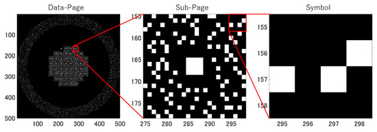 Then, a recording pattern called 3:16 modulation coding [9], which is generally used in holographic memory, was used as the signal pattern, and 51 subpages in one data page were arranged as shown in Figure 2. In this coding scheme, one subpage was composed of 32 symbols and one sync mark at the center for alignment. Then, one symbol was composed of pixels, of which only pixels were ON pixels, and arranged without being adjacent to each other. Depending on the number of combinations of the three ON pixels, the data capacity of byte per symbol was obtained, and as a result, the entire data page had a data capacity of bytes.